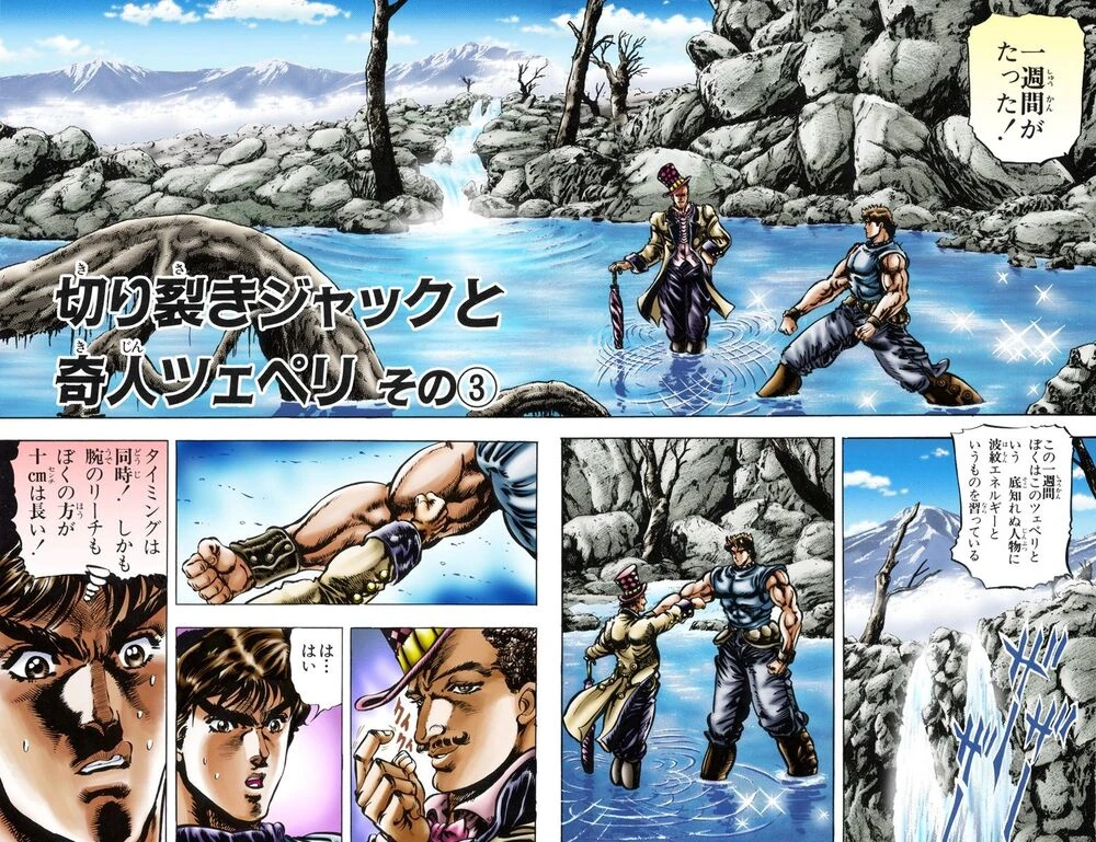 Repitiendo una sesión de entrenamiento, Jonathan y Zeppeli se colocan uno frente al otro. JoJo nota que su brazo es más largo que el de Zeppeli, aún así cuando ambos intentan golpearse el uno al otro al mismo tiempo, el Maestro Hamon de alguna manera logra extender su brazo lo suficiente como para golpear a Jonathan primero. Zeppeli le dice a este último que un humano corriente es incapaz de hacerle frente a la Máscara de Piedra, no importa su fuerza ni velocidad, por eso deben usar métodos poco ortodoxos, también le advierte que el Hamon es sensible a los cambios de humor y estrés, por lo que debe tener cuidado para mantener el ritmo de su respiración. Jonathan entonces recuerda la vez que su maestro le contó sobre su pasado y el porqué busca a la Máscara.