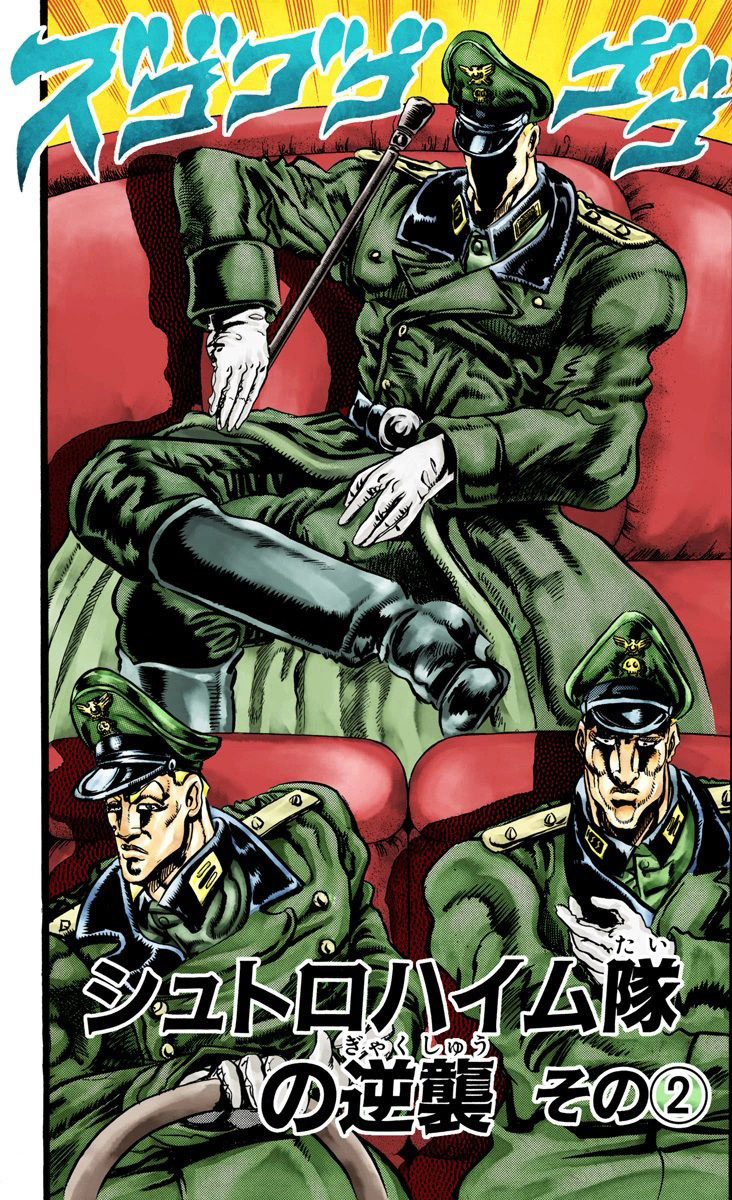 Kars ataca al general con las cuchillas de sus brazos justo cuando Joseph entra en la habitación para preguntarle al general dónde está la comida. Cuando Kars golpea la mano del general, la piel del general se desprende, revelando una mano mecanizada debajo. Kars corta el sombrero del general y se retira, revelando para sorpresa de Joseph que el misterioso general es Rudol von Stroheim.