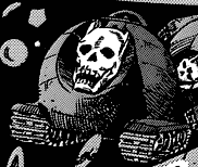 Sus hombros, el dorso de sus manos, la hebilla del cinturón, ambos lados de sus tobillos y la parte superior de sus pies llevan el emblema de un cráneo con orejas semejantes a las suyas; en diversos tamaños y decoración externa.