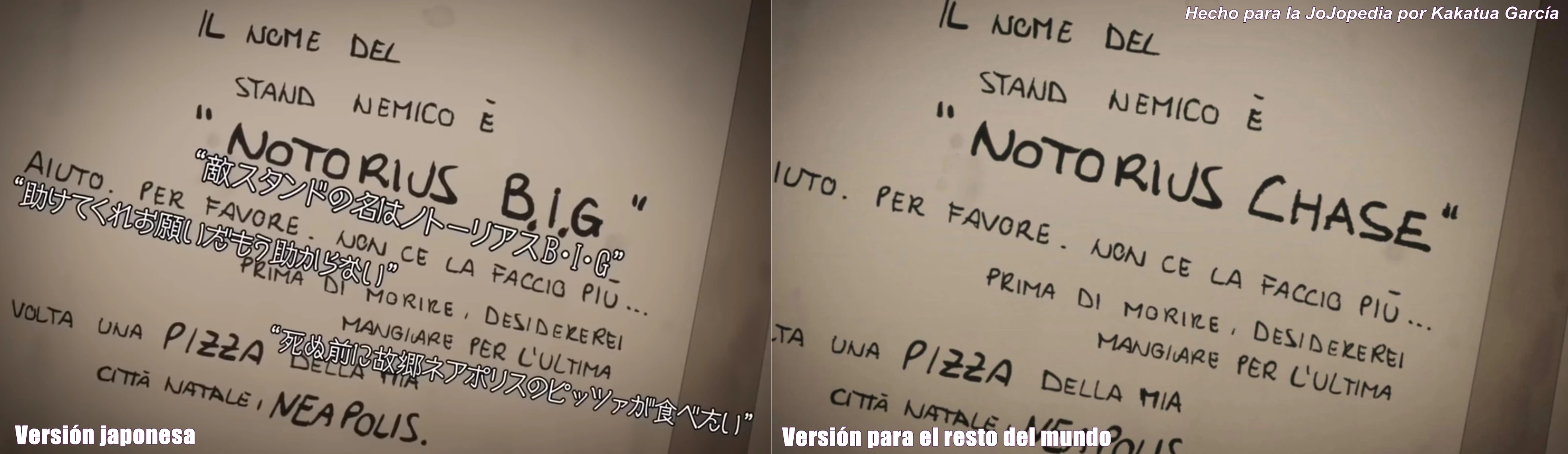 Comparación de versiones, nótese el nombre del Stand en la versión japonesa original con la del resto del mundo.