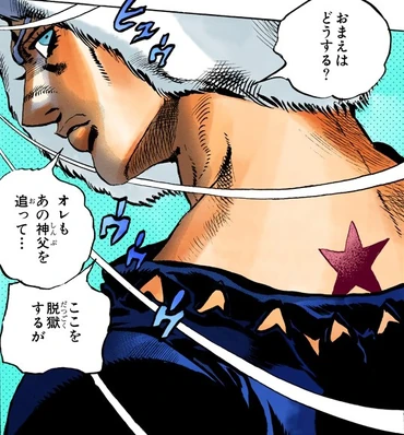 Of course, first of all we can obviously see the classic "ominous" sound effects floating around her, and the pose is a pretty obvious reference to Jonathan. Her colour scheme could possibly be influenced by Jodio, but that's pretty deep cut. Although, speaking of deep cut, get hair bears a striking resemblance to the wall eyes from Jojolion. The stars on her glove and belt may be a nod to the star birthmark, though in this case it's a six-sided one. Tbh, I have no idea what the gun arm is supposed to represent. The texture of her shoulder pad may be in reference to Star Platinum's gloves, and her long coat is pretty obviously based on the one that Jotaro wears. Speaking of which...
