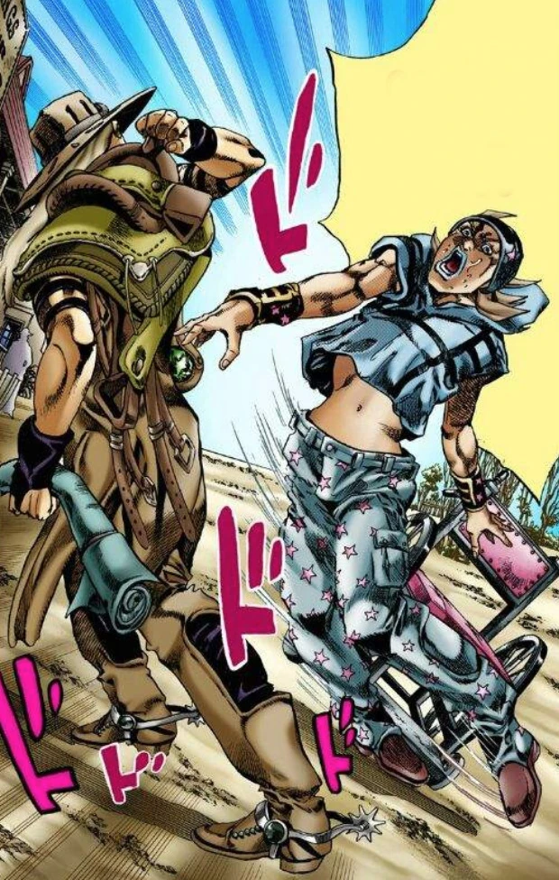 Ночью, Джонни и Джайро разбили лагерь. Выполняя упражнения в Спине, Джонни удаётся создать убедительное вращение с пробкой. Джайро обнаруживает другого всадника и поднимает вопрос об их собственной безопасности. Джонни ищет свой пистолет в их багаже и случайно пролистывает газеты, вырезанные в сумке Джайро, но он был остановлен Джайро, который закрывает тему своего прошлого.