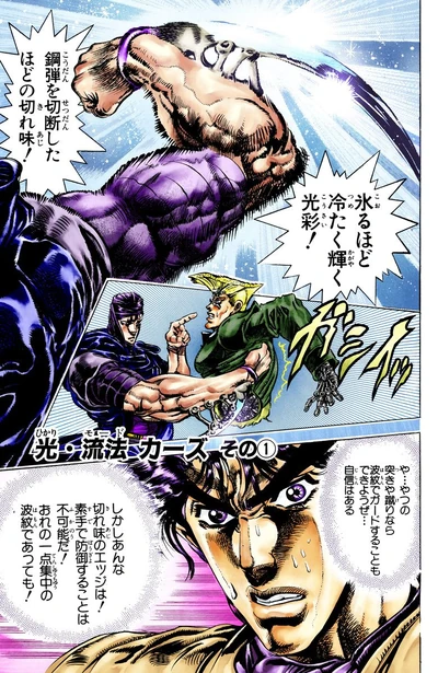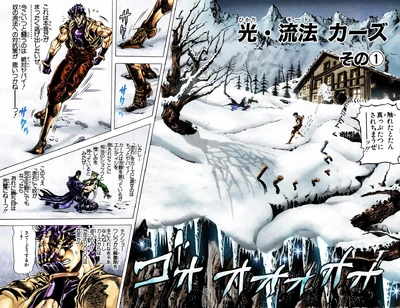 Камень начинает скользить по снежному склону в сторону скалы. Появляются Лиза Лиза и Цезарь и становятся свидетелями того, как ДжоДжо и Карс гонятся за камнем. Пока ДжоДжо находится ближе к нему, скорость Карса намного выше. ДжоДжо также упоминает внутри, что он не может бежать на полной скорости, иначе в конце концов он свалится со скалы на смерть. ДжоДжо пинает Карса, пытаясь удержать его подальше от камня и сам отправить с обрыва, но Карс уклоняется, тянусь ногой к камню. ДжоДжо рассказывает, что его удар не был нацелен на то, чтобы ударить Карса, а на то, чтобы пнуть по снегу и позволить ему притормозить и схватить камень. Однако в этот момент Карс пробивает ДжоДжо плечо светящимся клинком с его ноги, утаскивая его со скалы вместе с ним.