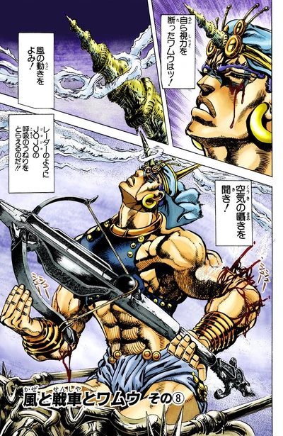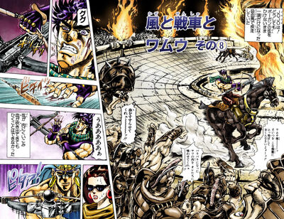 «Ветер, колесница и Вамм, Часть 8», при публикации в журнале WSJ «Выстрел с другой стороны!», — 58 глава в части «Боевое стремление», а также 102 глава во всей серии манги Невероятные приключения ДжоДжо.