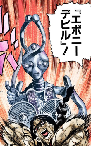 Ebony Devil (エボニーデビル(悪魔) Ebonī Debiru?) — это стенд Дево Проклятого, появившийся в третьей части серии Невероятные приключения ДжоДжо, Крестоносцы звёздной пыли. Он активируется, как только пользователь получает урон, и его сила возрастает в зависимости от ненависти пользователя к нападавшему. Затем стенд войдёт в близлежащий физический объект, например, в куклу, позволяя пользователю управлять им дистанционно.