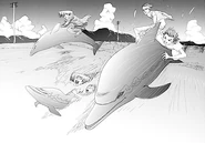 Рохан и Хорхе задаются вопросом, есть ли там кто-нибудь, кто мог бы быть Кирой. Ему пришлось бы схватить кого-нибудь по дороге в салон красоты, но Кира был осторожным человеком и не мог полагаться на подобные совпадения. В салонах красоты редко работают мужчины, но у Айи был мужчина, который помогал ей в её тайных делах. По словам Ямагиши, мужчина был средних лет и неплохо выглядел. Рохан считает, что простое стояние и наблюдение за людьми ни к чему не приведет, поэтому он отправляется к Коджи. Мэр Морио, Дента Шишимару, благодарит Хорхе и остальных за спасение. Он был в ужасе от того, что его собственный секретарь пытался сжечь его до смерти, хотя секретарь отвечает, что мэр сначала облил его бензином. Шишимару спрашивает, как они все долетели, но Хорхе отрицает, что они летели. Хорхе выходит из спортзала и видит, что Arrow Cross House трясется из стороны в сторону, что являлось сигналом SOS, на который они решили. Используя Grand Blue, они быстро летят обратно в Arrow Cross House. Рейми говорит, что люди из гавани внезапно попытались сжечь дом, но она засунула их всех под дом с помощью своей способности, а то, что дом трясется, было просто результатом битвы.