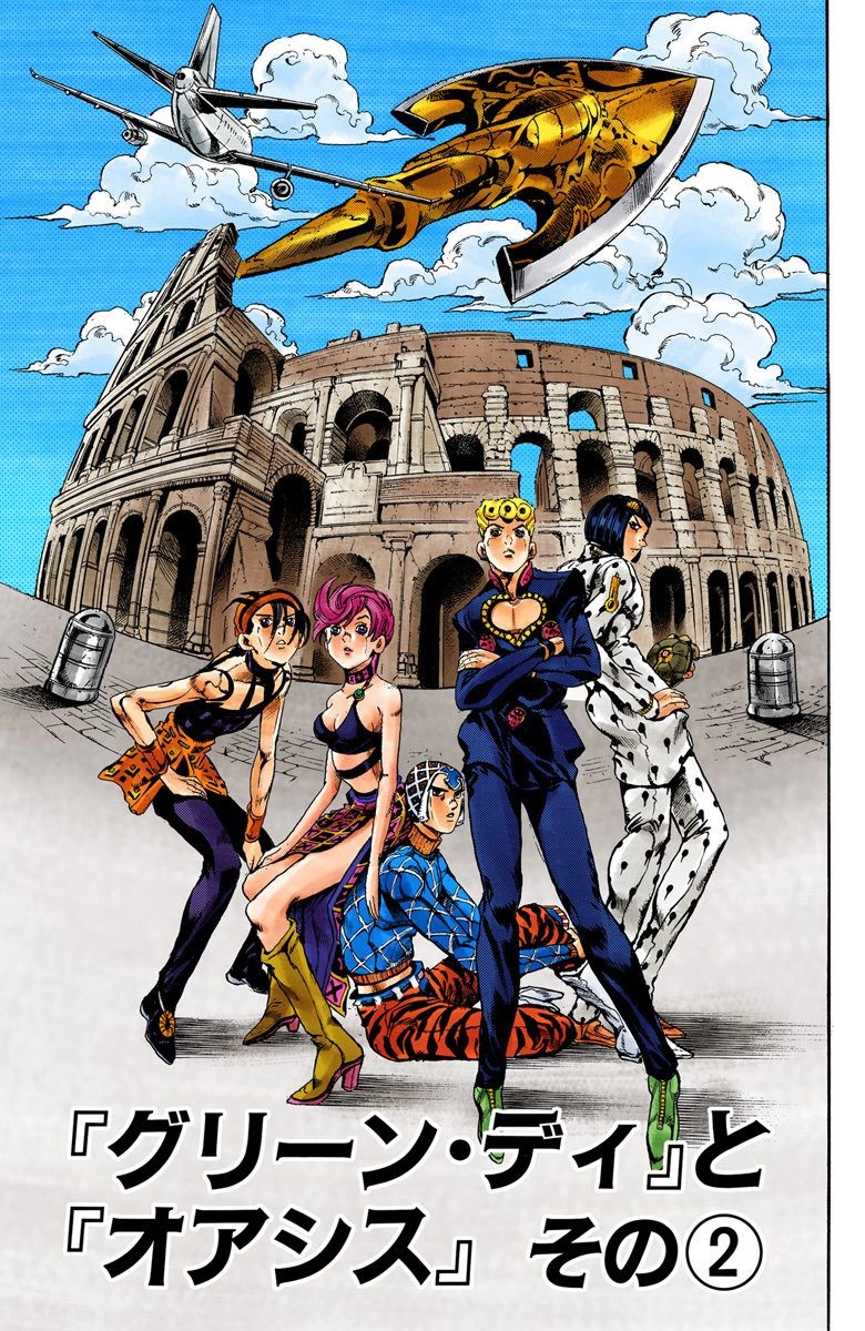 Mista and Bucciarati slowly go up the stairs connecting the shores to the streets proper, planning to steal a car and go up the hill road. Bucciarati sees cans of beer fall from the decaying hand of one of Green Day's victims. He pays no mind to it until he sees that they've disappeared.