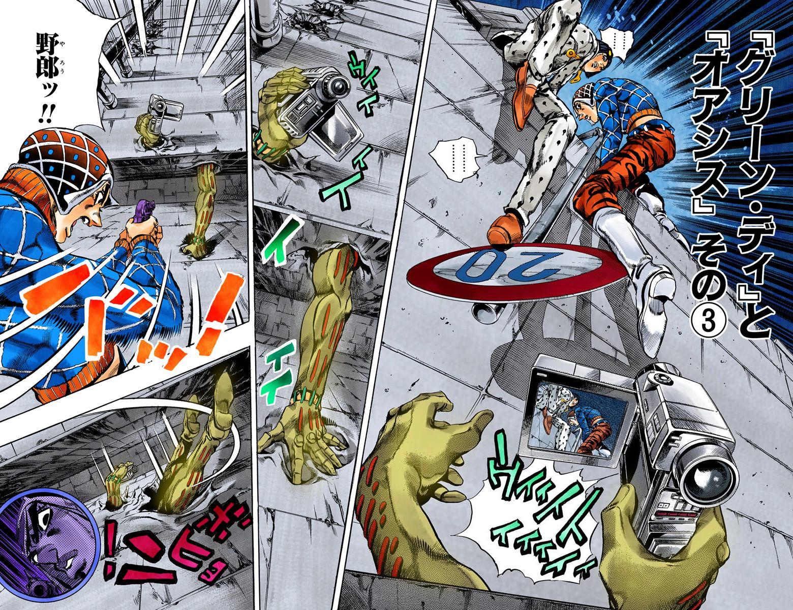 Mista and Bucciarati climb into the streets and see an opened car with its driver near it. Hands emerge from the ground, holding a camera and filming them. The enemy then jumps from inside the collapsed stairs to under the street.