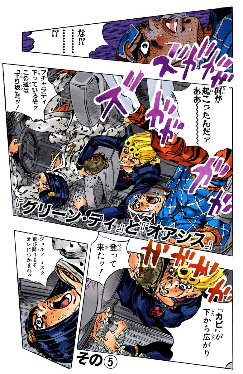 "Green Day" and "Oasis", Part 5 (『グリーン・ディ』と『オアシス』 その⑤ "Gurīn Di" to "Oashisu" Sono 5), originally Panic in Rome!! (パニック・イン・ローマ!! Panikku in Rōma!!) in the WSJ release, is the one hundred nineteenth chapter of Vento Aureo and the five hundred fifty-eighth chapter of the JoJo's Bizarre Adventure manga.