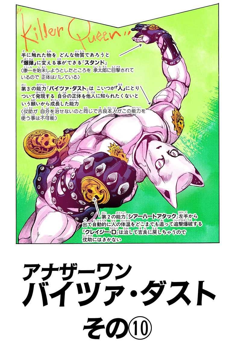 As Crazy Diamond attacks Killer Queen, Okuyasu exclaims that Kira was in front of them the whole time, under the guise of Kosaku Kawajiri. Josuke then says that it has to be more than a coincidence that this happened and that Hayato must have done something, as Josuke was oblivious to the effects of Bites the Dust. Kira then proclaims that he switched identities with Kosaku not because he was fleeing from the Joestar Group, but because he wanted to enjoy a quiet life again. He then goes on to say that he could have killed them all at any given time but didn't, simply because he doesn't have a taste for battle. As this goes on, Rohan, Jotaro, and Koichi look on from a distance.