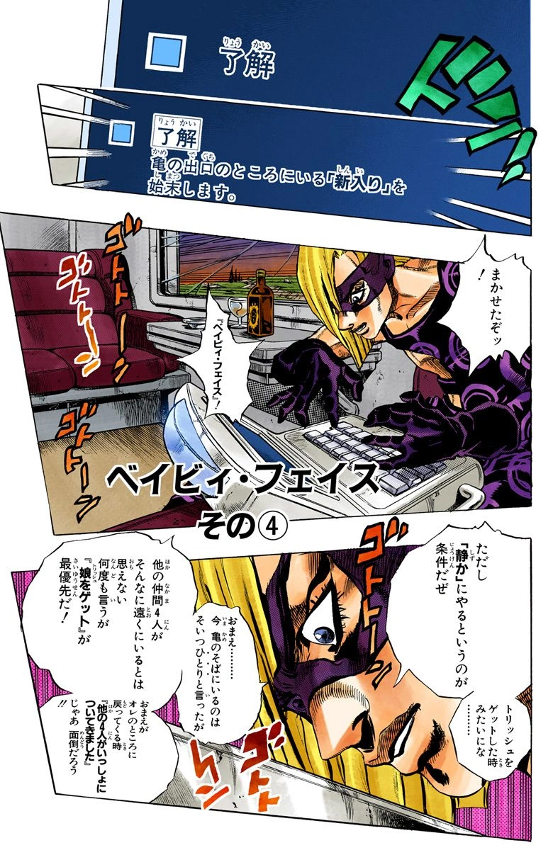 Baby Face, Part 4 (ベイビィ・フェイス その④ Beibyi Feisu Sono 4), originally Scrape Away (けずり取る Kezuri Toru) in the WSJ release, is the sixty-fourth chapter of Vento Aureo and the five hundred third chapter of the JoJo's Bizarre Adventure manga.