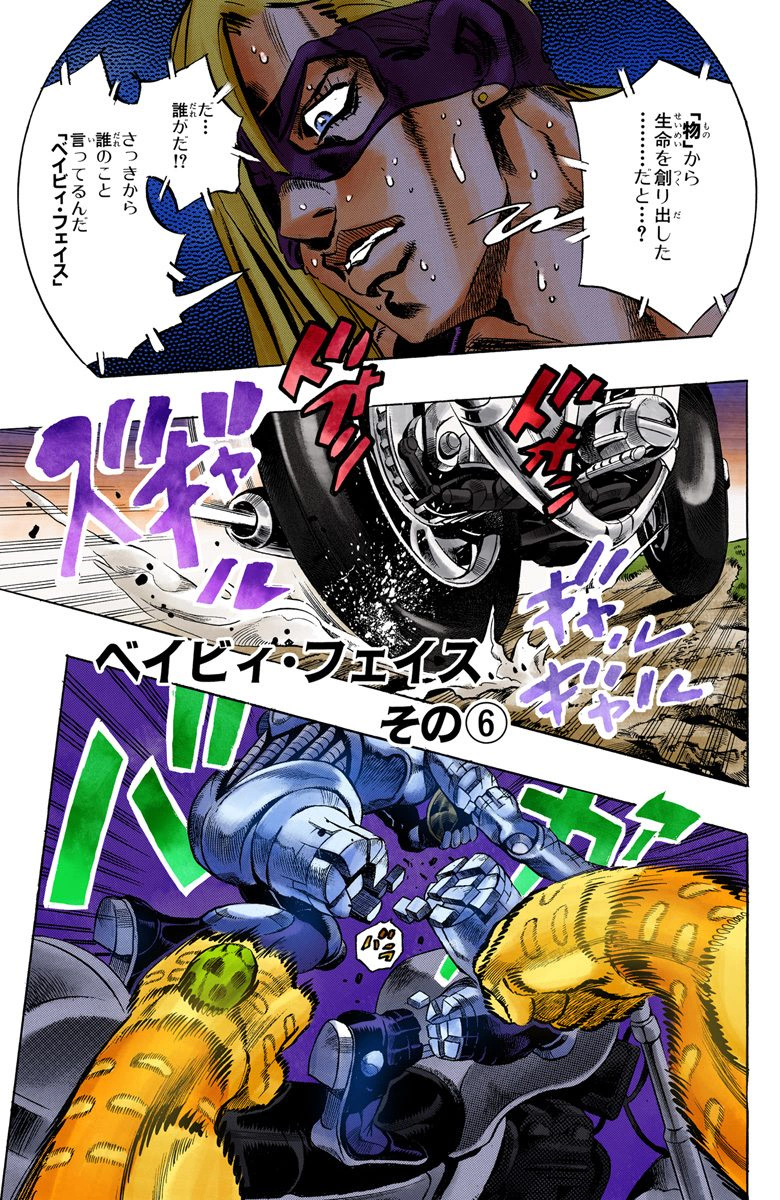 Gold Experience transforms the motorcycle into vines, tying Baby Face up. This forces it to abandon the motorcycle and Coco Jumbo; the turtle landing near a group of rocks. Baby Face panics but at Melone's command, waits for Giorno to go get the turtle and attack him, posing as his shadow.