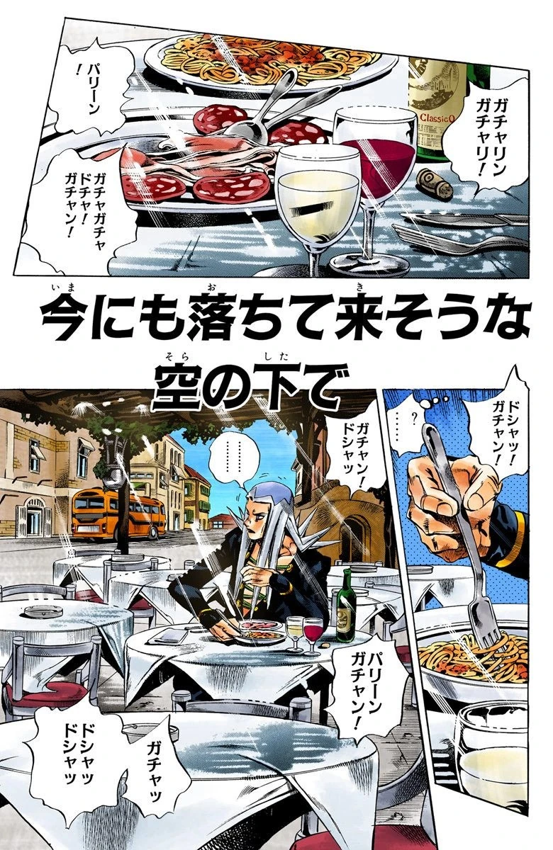 Abbacchio finds himself eating at a restaurant, and sees a policeman investigating numerous pieces of broken glass, looking for handprints. Abbacchio asks if the policeman isn't bothered by the effort and the corruption which will allow the culprit to be freed even if the police catches him. The policeman replies saying that he isn't looking for results, for people lose sight of reality if they do so; He's instead looking for the truth.