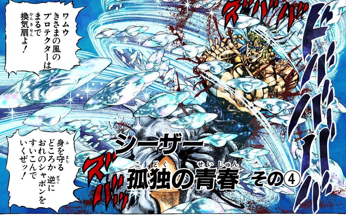 Back inside, Wamuu prepares his Holy Sandstorm but is stopped at the revelation that Caesar placed hundreds of Bubble Cutters around him. Caesar reveals that his Cutters can act like lenses, refracting the sunlight and magnifying it in Wamuu's position. Wamuu freezes in place when Caesar goes in for the finishing blow, but for a single instant, Wamuu was within Caesar's shadow, allowing him to pull off a devastating Holy Sandstorm.