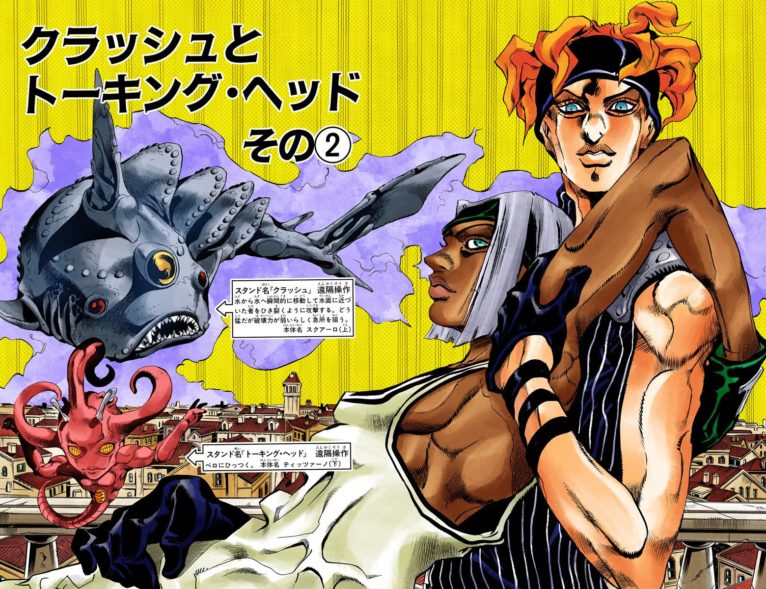 Narancia cannot stop himself from feeding the group false information about Clash and how to evade it, suggesting against his will that the group take the boat. Bucciarati nonetheless tells them that they need to dispose of the enemy first, regardless of the Stand, since it's obvious it is remotely operated and tells Abbacchio to rewind to events of Clash's attack.