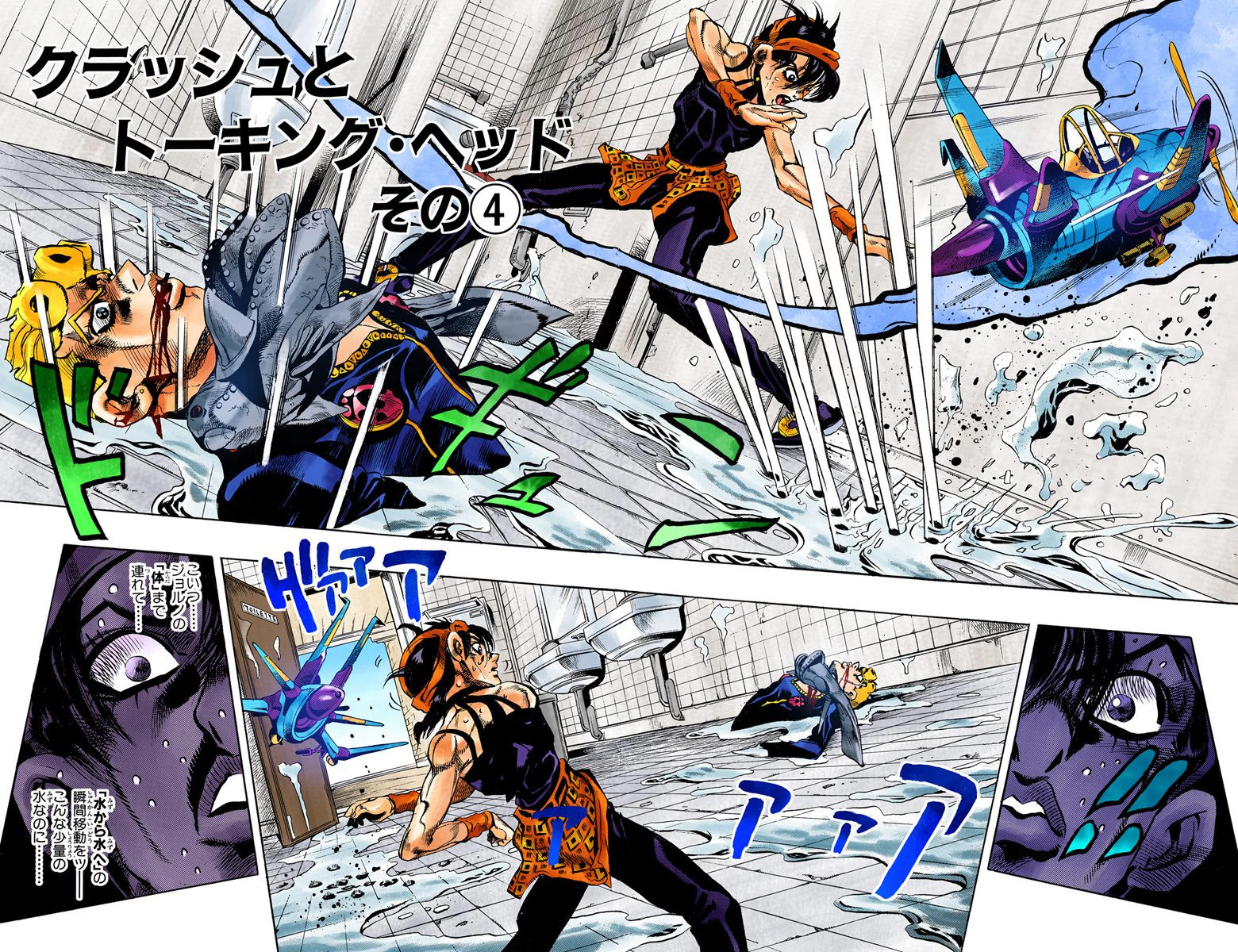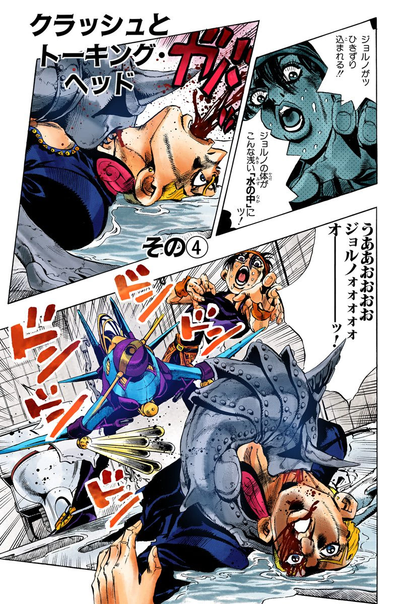 Squalo teleports in a puddle near a toilet bowl, and Narancia shoots it. However, Clash burrows itself into Giorno's wound, and Narancia only hit Giorno's chest and the toilet bowl, enabling Clash to teleport into the sewer and stopping Giorno's breathing.