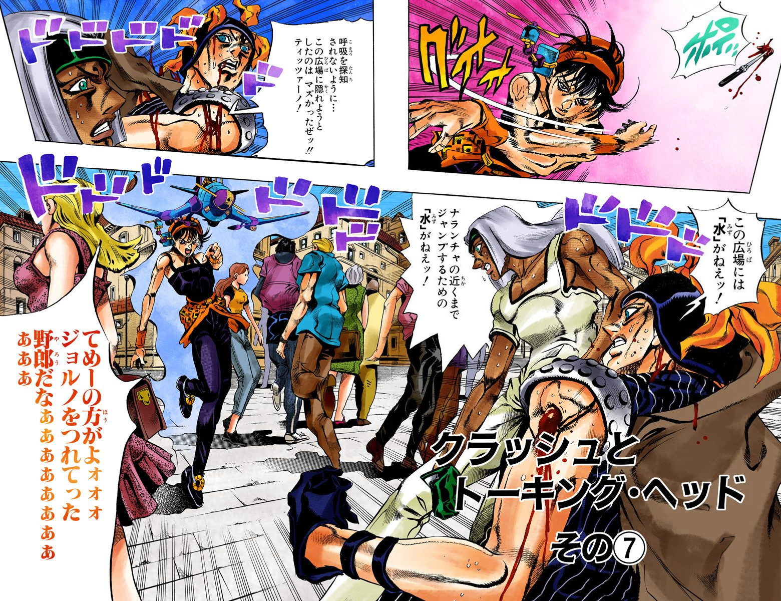 Clash and Talking Head, Part 7 (クラッシュとトーキング・ヘッド その⑦ Kurasshu to Tōkingu Heddo Sono 7), originally You 'Flinched'?! (「ひるむ」だって!? 'Hiromu' Datte!?) in the WSJ release, is the ninety-second chapter of Vento Aureo and the five hundred thirty-first chapter of the JoJo's Bizarre Adventure manga.