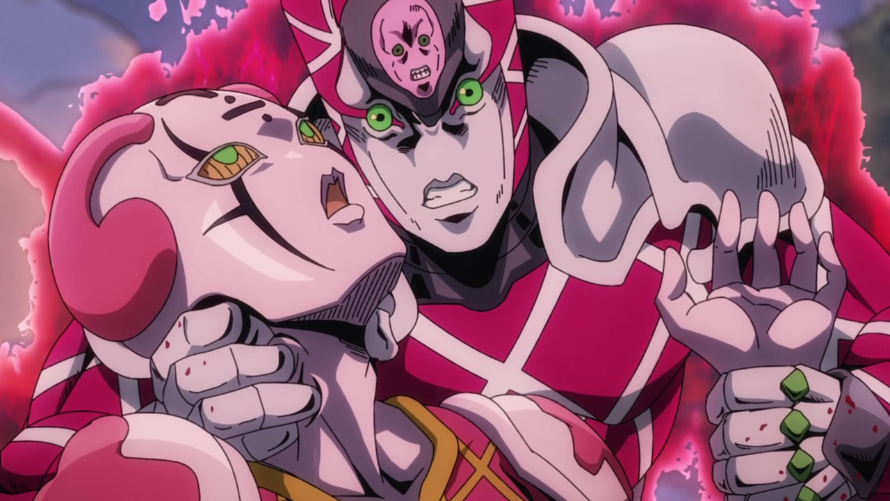 - King Crimson's face is no longer shown after Mista's gun breaks.