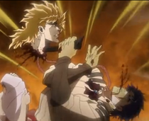 When Hol Horse reports on the defeat of Alessi and Mariah, DIO questions him about his inability to fight, which makes the cowboy turn against DIO. DIO surprises him with his power, leaving a fearful Hol Horse to return to his side. Not long afterwards, when Vanilla Ice comes to inform him of Telence T. D'Arby's defeat, Vanilla volunteers his life to complete DIO's assimilation of Jonathan's body and subsequently slices off his own head. DIO then utilizes his own blood to revive Vanilla as a vampire. After Vanilla's defeat, DIO's face is reveals himself before the Joestar group for the first time when he confronts Polnareff on a set of stairs. He toys with Polnareff for a while but when it becomes clear that Polnareff won't rejoin his ranks, DIO prepares to kill him - only to be interrupted by Joseph, Jotaro and Kakyoin breaking down a wall and flooding the stairs with sunlight.