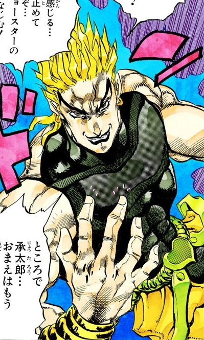 In 1987, he first meets Enrico Pucci[15] while hiding in a church waiting for the sun to set. July of 1988, he goes on to encounter Muhammad Avdol in Egypt and around the same time, his Stand experiences its first instance of stopping time. In August, he meets Noriaki Kakyoin while the latter is vacationing in Egypt and fights and brainwashes him as well.