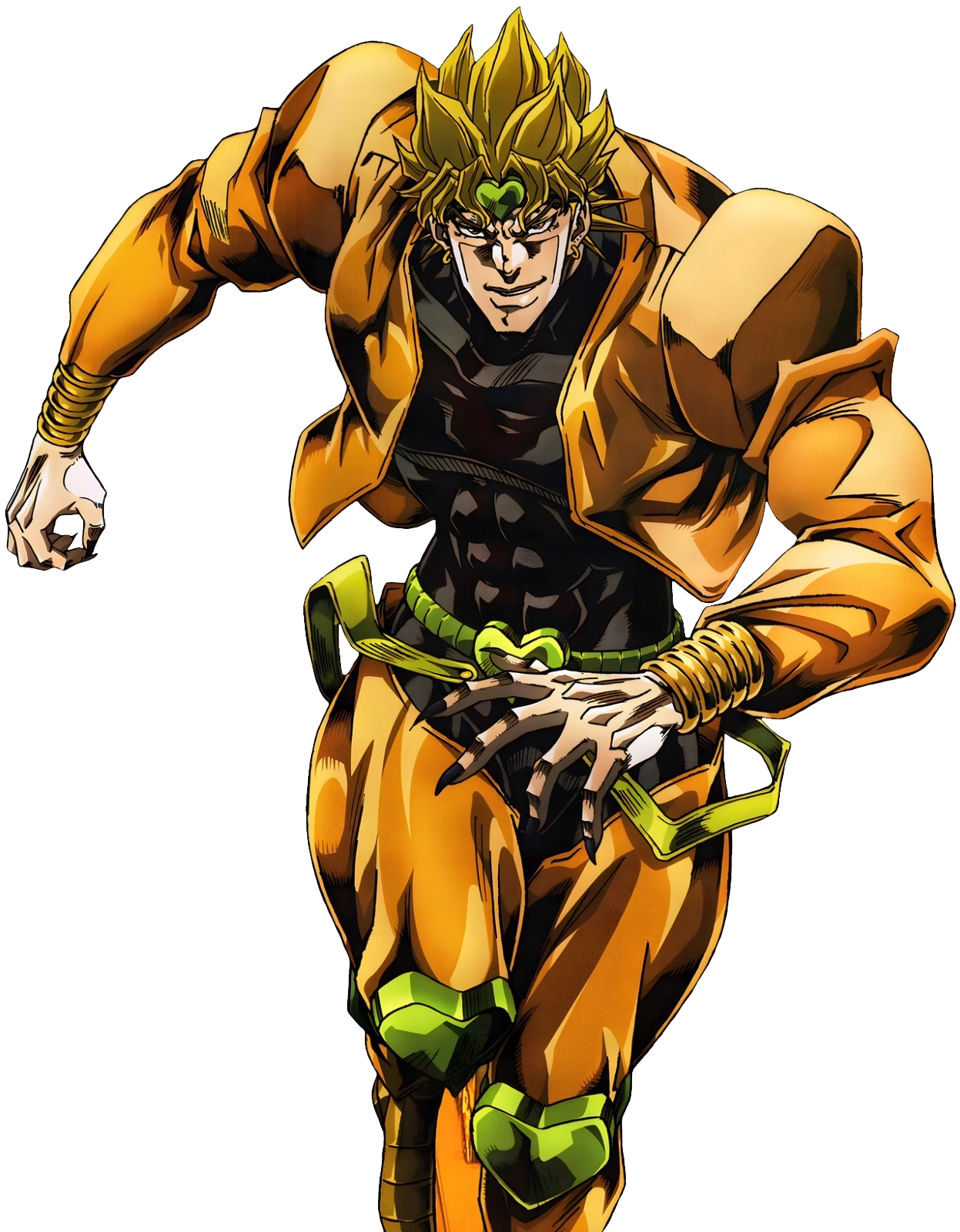 DIO dons a jacket with a tight tank-top underneath, as well as chaps with an exposed crotch. His face is now in full-view, and on his head is a heart-shaped circlet to match his knee guards. This is his form during the beginning of the DIO's World story arc. In most depictions of him, DIO's outfit is tinted orange or yellow.