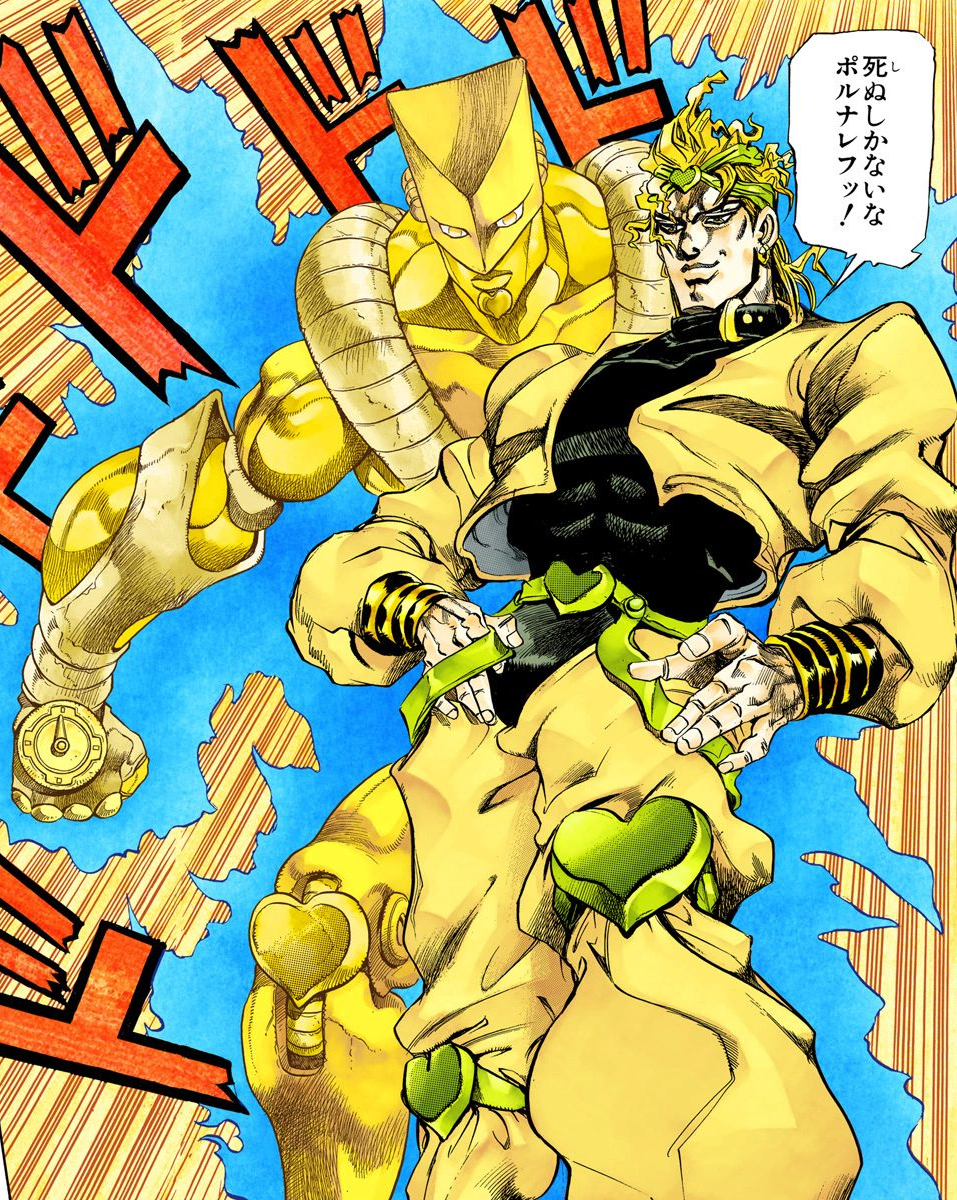 As evidenced above, Dio's enunciation of his Stand and its power has also reached significant popularity, the full line in question being: THE WORLD, Time, stop! (
