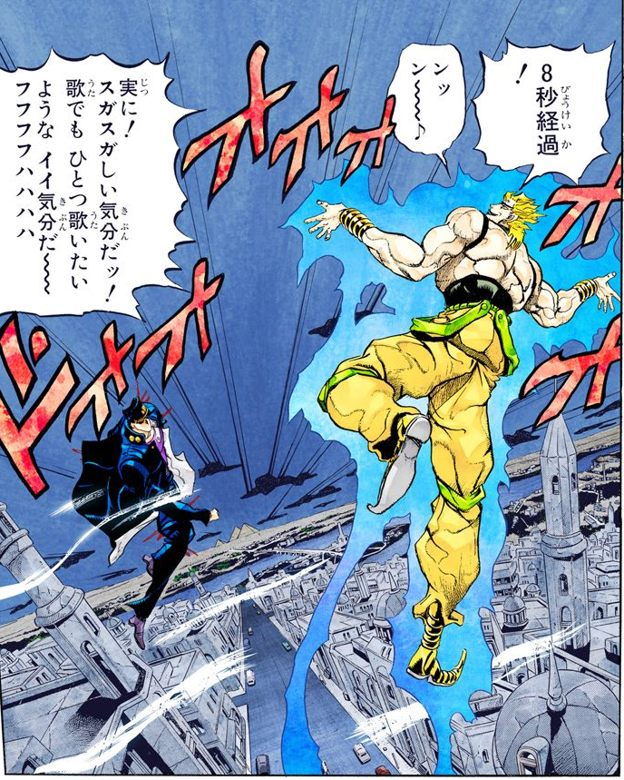 About a year after gaining his Stand, DIO discovered that it is capable of stopping time. At first, he could only do this for a very short amount of time, but by the end of Part 3, he is able to stop time for a maximum of 9 seconds.[11] This duration would have continued to develop had DIO not been defeated. When stopping time, DIO gives the impression that he is teleporting or otherwise moving at impossible speeds.