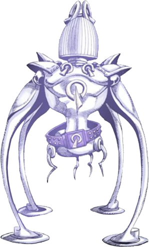 Fun Fun Fun possesses a bell-like head, lined vertically, and a humanoid torso; its waist utterly emaciated, truncated mid-hip. From its hips hang four small leg-like vestiges, while it stands on four disc-like feet from four long, bending legs or tendrils hanging from its shoulders; capped by four thin, sharp shoulder pads. Two roughly Q-shaped pieces rest atop its head, facing its sides, with two smaller shapes on its collar, one large in the center of its chest, and one small on the buckle of a thick, studded belt that sits loosely on its hips.