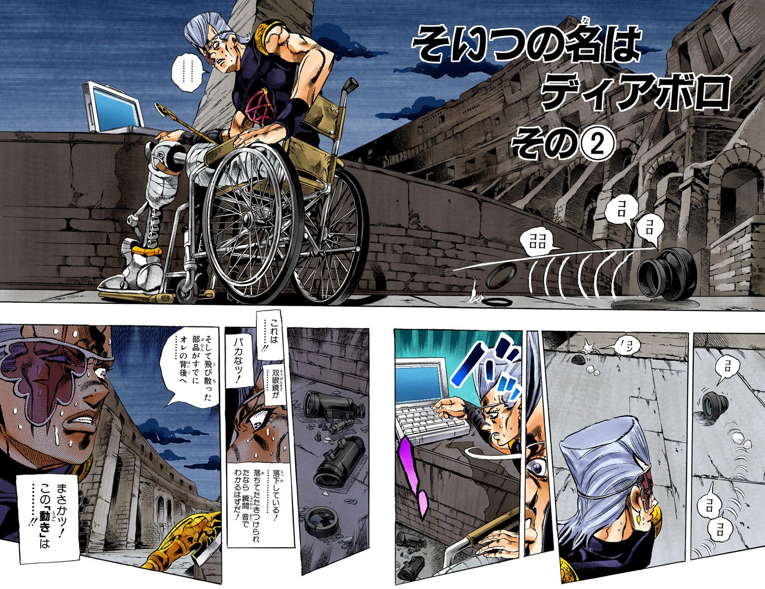 Polnareff realizes that time has been erased, and he sees Doppio morphing into Diavolo, whose appearance is fully revealed. Diavolo confronts Polnareff, demanding that he explains what he's doing here in Rome and rushes toward him for the kill.