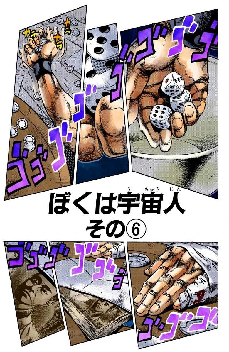 Josuke and Rohan have to play a last roll of cee-lo, with Rohan not knowing that his die is the shape-shifting alien Mikitaka, who works for Josuke and Tamami acting as an arbitrator. Rohan rolls first a 3-3-4, a normal roll, but with Josuke's relief being visible, Rohan guesses that Josuke has an accomplice. When Josuke takes the dice in his hand, he sees that Mikitaka is throwing up for having been thrown so many times and cannot roll yet. Rohan grows more suspicious and orders Josuke to show the dice.