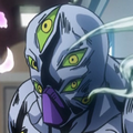 | The struggle to defeat Chariot Requiem continues. After Polnareff touches the Arrow, Giorno and Mista must protect him from Chariot Requiem and Mista must replace his inexplicably broken revolver with a pistol. After a short struggle, Chariot stops running after Polnareff and goes away with the Arrow, only for it to be revealed that everyone is beginning to mutate into otherworldy creatures because of Chariot. Meanwhile, Diavolo has seen Chariot's weakness. Time presses but Giorno suddenly tells everyone to be still: he's checked Mista's revolver and proves that it was sabotaged; from that he deduces that Diavolo is hiding into one of them. When Giorno checks on Bruno, Diavolo manifest from the same body as his daughter and attacks Giorno, severing him arm. Diavolo then catches up to Chariot Requiem, using time erasure to evade all attacks. In truth, a hidden light orb can be attacked behind each soul's head and King Crimson punches his orb to disable Chariot and take the Arrow. The group tries to prevent Diavolo from taking the Arrow, culminating in it being send in the air but King Crimson punching through his host's stomach to send himself flying toward the Arrow and kill Trish once and for all | |||