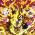 | The battle between Jotaro and DIO continues. Star Platinum has a slight advantage in strength, but DIO's superior skill prevails. Satisfied of his demonstration of power, DIO stops time, only to see Jotaro move his finger. Disturbed and then happy to see that Jotaro has used magnets to move in the stopped time, DIO comes near to strike Jotaro but the student reveals that he is really able to briefly move during the stopped time, Star Platinum punching through the Vampire. DIO heals by sucking the blood of a civilian and decides to surround Jotaro with knives which strike true despite Star Platinum's efforts to deflect them. Jotaro is down but still conscious. However, DIO is wary and tries to gauge whether Jotaro is alive or not. When the Vampire counters a foolish ambush attempt by Polnareff, Jotaro must move a bit to deflect DIO's attention off the Frenchman. Jotaro is forced to stop his hearbeat to a dangerous length to fool the Vampire but manages to restart his heart and, as DIO approached again, hits him in the head. Star Platinum pummels DIO but the Vampire has tricked Jotaro into sending him toward Joseph. Sucking the old man's blood, DIO has not only healed, but gained in power. | |||