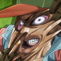 | The fight against Vanilla Ice begins. The enemy Stand User is challenged by Polnareff and Iggy, but Vanilla Ice can hide inside of Cream's mouth, creating an invisible floating sphere of destruction. Polnareff and Iggy are chased up to the art gallery on the second floor where Vanilla Ice ambushes Polnareff and takes out his foot. When Vanilla Ice gets out, he is greeted by a DIO sand clone courtesy of Iggy but sees through the trick, uncovering Polnareff and Iggy and violently beating down the dog for daring imitate his master's likeness. Polnareff sends Silver Chariot to save Iggy and uses the scattered sand to detect Vanilla Ice, attacking him when he peeks out of Cream. Despite the sword in his mouth, the enemy refuses to die and takes a chunk of Polnareff's leg, immobilizing him. Cream begins to circle around the art gallery, threatening to reach Polnareff who cannot move. Finding no escape, Polnareff salutes Iggy one last time. | |||