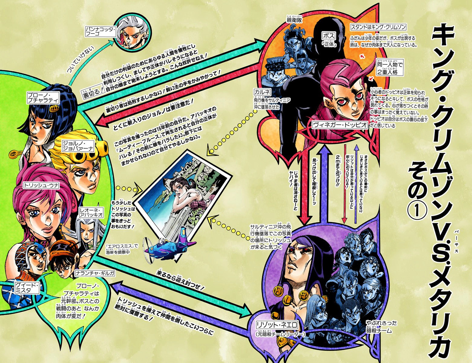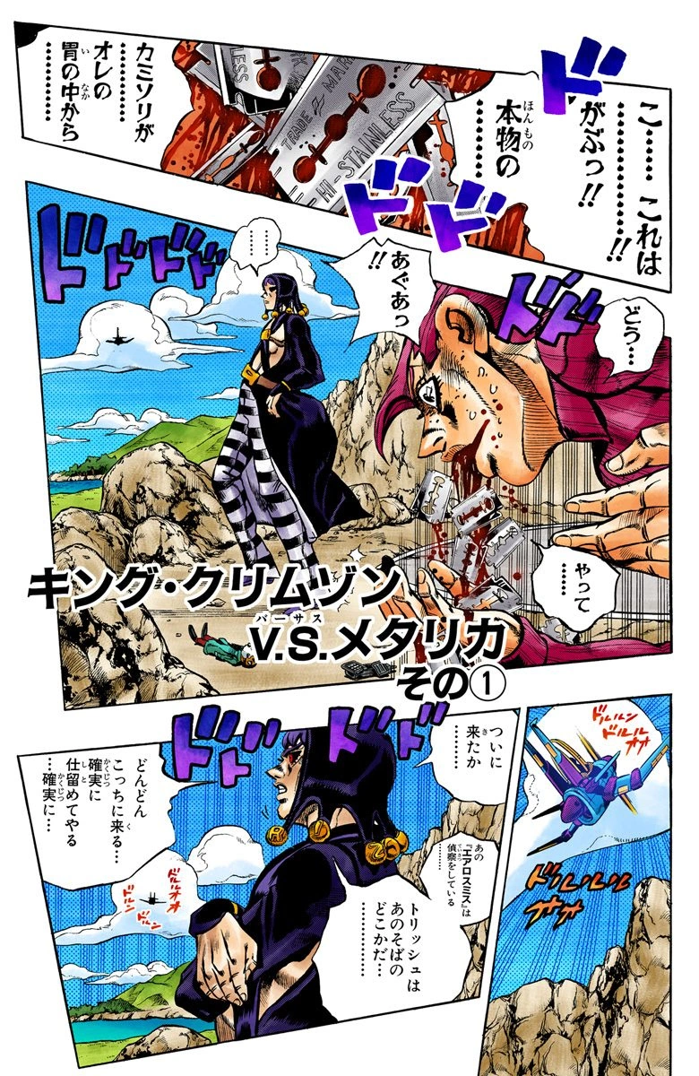 Doppio charges toward Risotto to get in range of his power, but needles appearing in his mouth force Doppio to stop and get them out while Risotto disappears into the landscape. Doppio receives a phone call and desperately asks what to do.