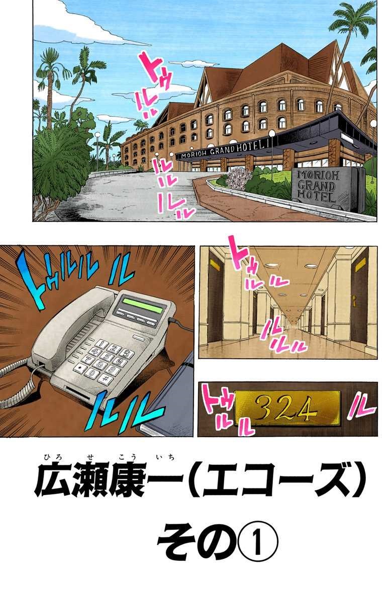 Koichi Hirose (Echoes), Part 1 (広瀬康一(エコーズ) その① Hirose Kōichi (Ekōzu) Sono 1), originally The Sinful Boy (罪深き少年 Tsumibukaki Shōnen) in the WSJ release, is the nineteenth chapter of Diamond is Unbreakable and the two hundred eighty-fourth chapter of the JoJo's Bizarre Adventure manga.