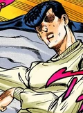 Okuyasu says that even though his eyes are open, Josuke's anger made him unable to see clearly. Rohan says that this was a part about Josuke that wasn't in Koichi's memory and asks him why Josuke gets so angry about his hair. Koichi explains that when Josuke was a child, he got a strong fever. His mother tried to drive him to the hospital but got stuck in a blizzard. Suddenly, a man wearing a school uniform helped them by pushing the car and putting his uniform under the car's wheels so they could pass over the snow. The student then took his uniform jacket and walked away. The only part of him that Josuke saw was his hair, and his current hairstyle is a tribute to the mysterious man.