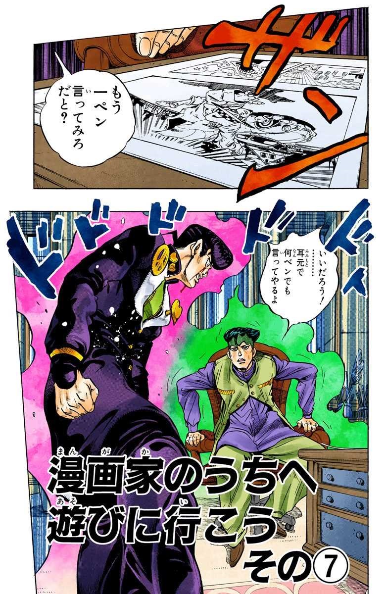 Rohan grabs a pen and starts to draw, saying that it makes a wonderful story. Josuke then spots him and continues punching him. The ending sidenote says that Rohan's Manga "Pink Dark Boy" will be switched to a monthly schedule, possibly indicating that he is either in the hospital or that he no longer has the inspiration for a weekly manga.