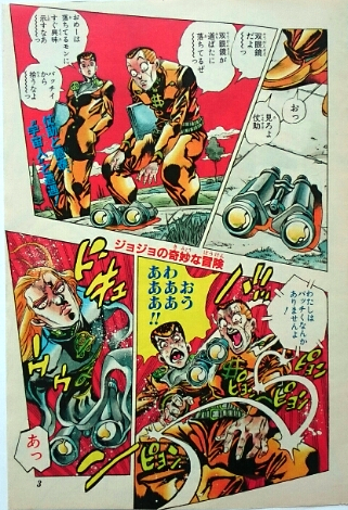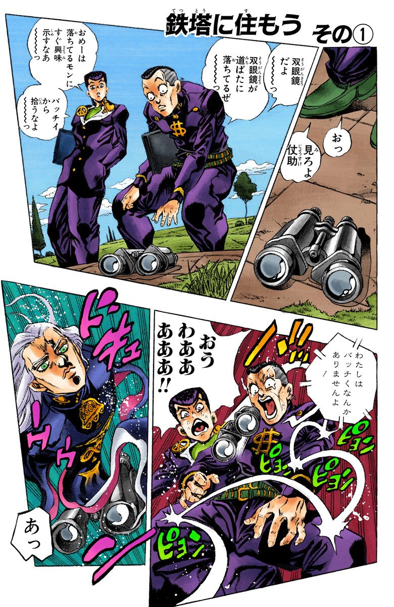 Josuke and Okuyasu find a pair of binoculars lying on the ground, but it ended up being Mikitaka who transformed into the binoculars while waiting for them. Mikitaka explains that he's spotted a suspicious decommissioned electric tower from which smoke is rising. Using Mikitaka as binoculars, Josuke spots a tea kettle in a burning stove, as well as clothes, and several pieces of furniture. Okuyasu takes the binoculars and sees a man catching a fish then immediately cooking it with vegetables grown on the tower.