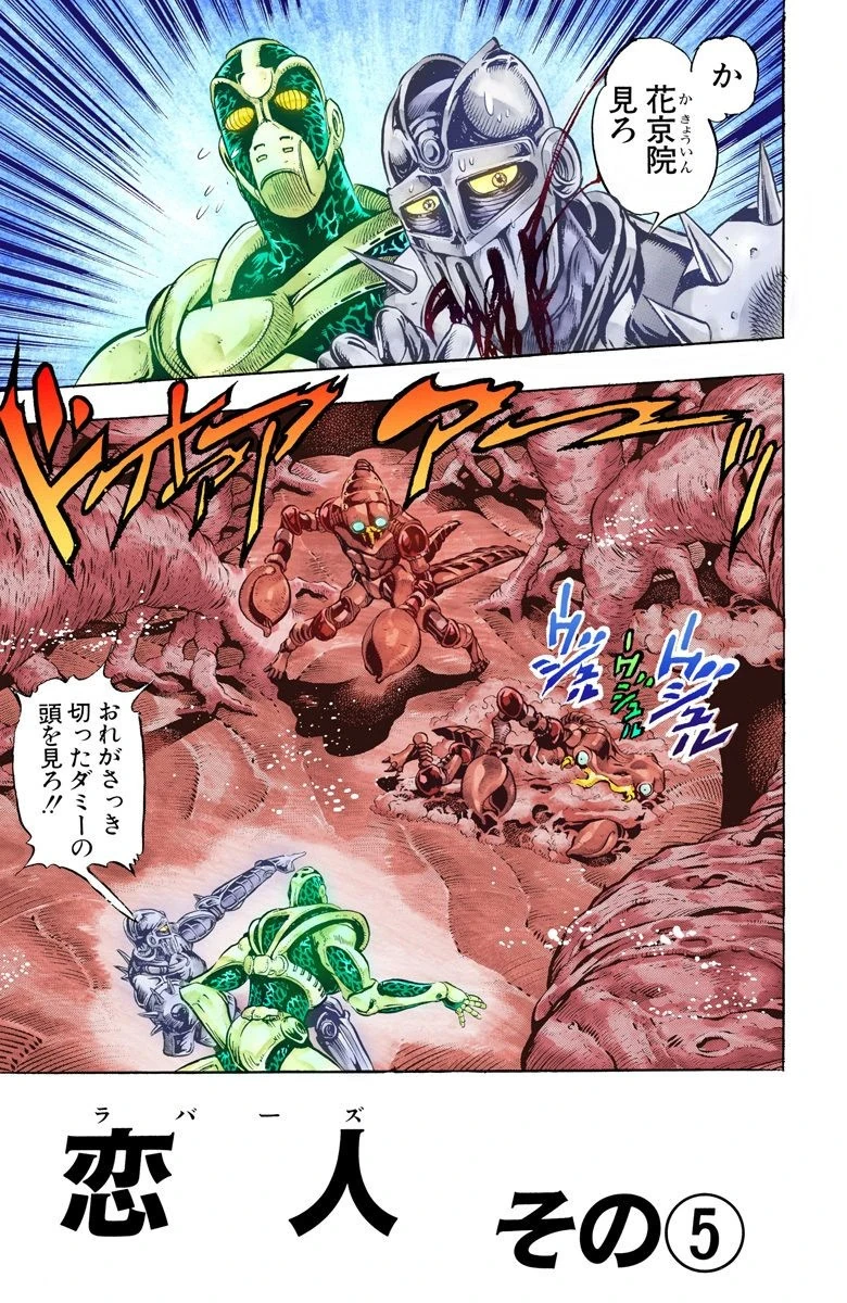 Much to Polnareff, Joseph, and Kakyoin's surprise, the clone Polnareff had destroyed regenerates and forms more clones. Lovers says that he knows for a fact that he isn't strong or fast enough to hurt them, but he knows himself and he knows their weaknesses. Lovers forms more clones and neither Silver Chariot nor Hierophant Green can figure out who the real one is. Silver Chariot is badly hurt and so is Polnareff, but he refuses to back down, even when Joseph tells him to call his Stand back. Lovers is sure of his victory and claims that the weakest Stand in history is also the scariest.