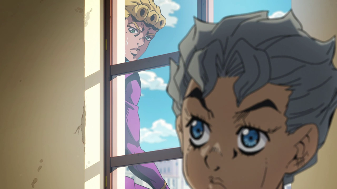 Giorno heads to his current home, a small student dorm in a middle-high school. Setting up his lighter to keep it stable and protect it from the wind, Giorno suddenly hears his door opening. Spotting Koichi Hirose who's managed to find him, Giorno must hide outside of the window, unable to intervene as Koichi searches the room for his passport and risks putting out the flame should he find it. Cornered, Giorno attempts to transform a lamp into a snake biting into the bread holding the lighter, but the snake accidentally burns itself. Koichi spots the lighter but is fortunately distracted by his found passport, allowing Giorno to snatch the lighter unnoticed.