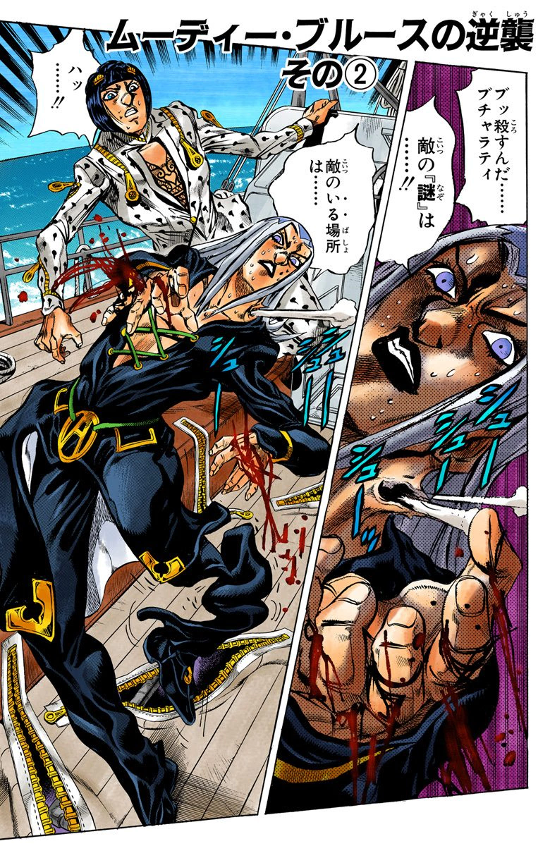 Bucciarati reveals the enemy's location. By observing where the blood from Abbacchio's wound fell, Bucciarati realized the enemy's secret: Mario Zucchero was able to hide a yacht within Bucciarati's yacht and hide himself and his hostages within the second yacht, making it impossible to find. Zucchero attempts to kill Abbacchio, but Bucciarati zips off his head with Sticky Fingers.