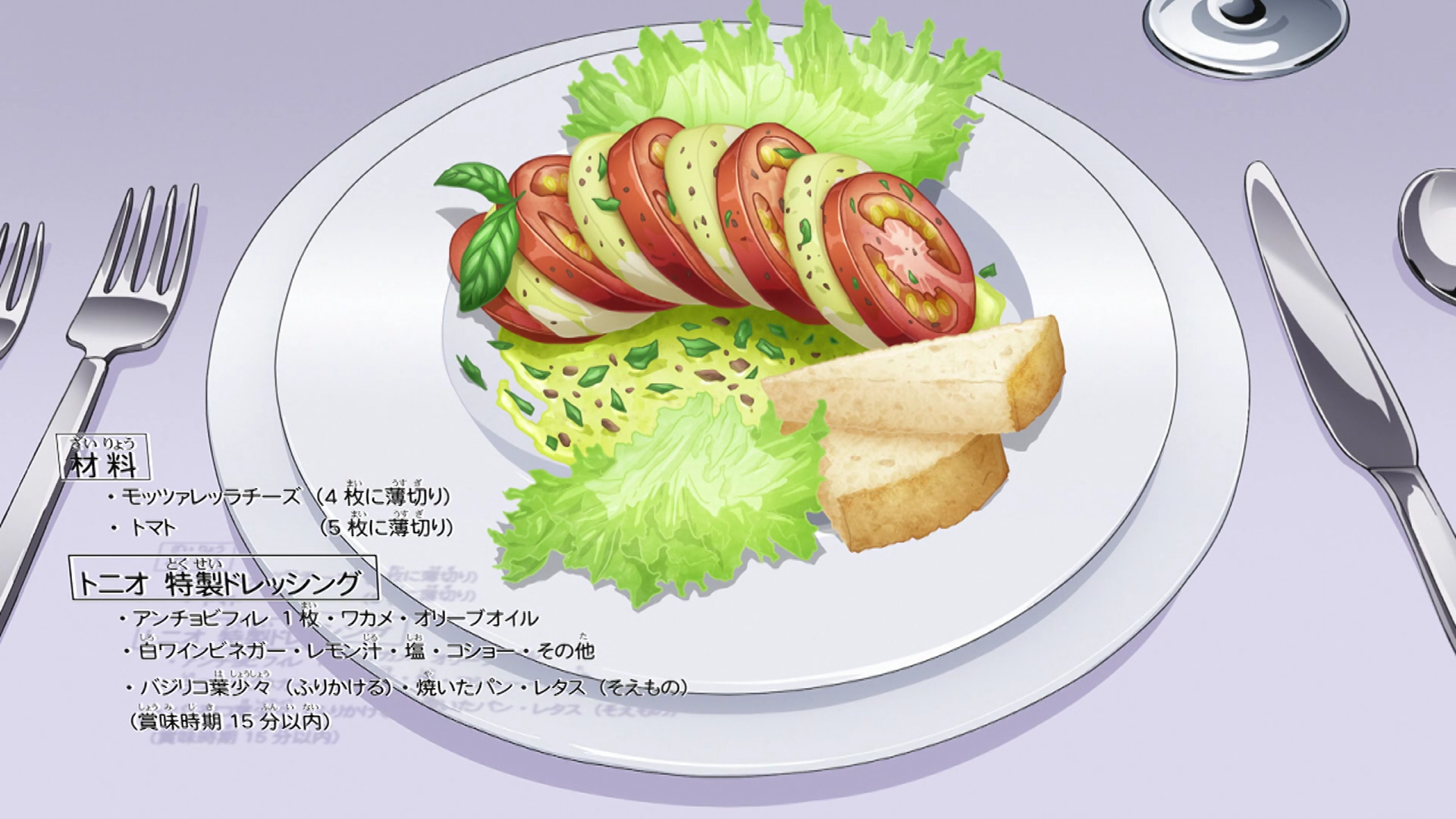 Ingredients: Mozzarella cheese (4 Thin Slices), Tomatoes (5 thin slices), Tonio's Special Dressing (Anchovy Fillet (1), Seaweed, Olive Oil, White Wine Vinegar, Lemon juice, Salt, Pepper, A bit of Basilico (flakes), a piece of toast, lettuce (as a side).)