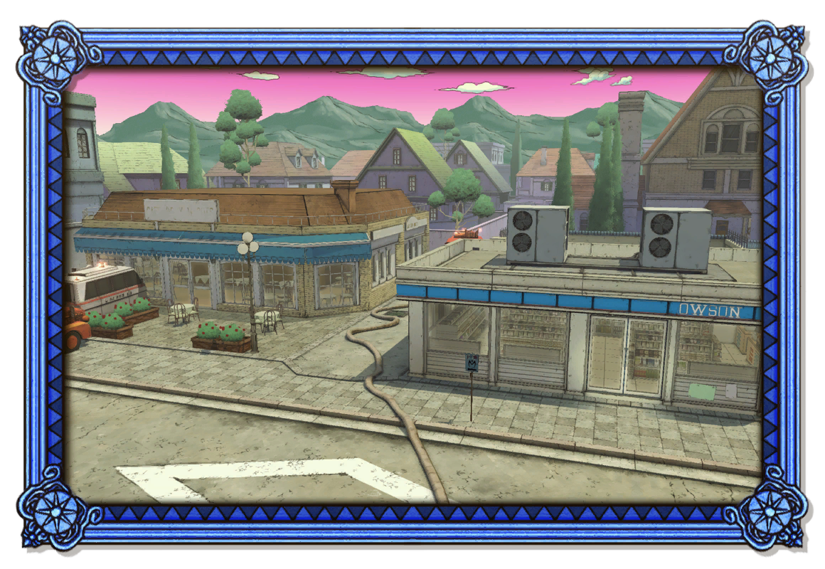 The location of the last battle reappears as a stage in Eyes of Heaven, with Café Deux Magots, grocery store Owson, and the Ghost Girl's Alley in the nearby area. A new stage, Boing Boing Cape, is also available.