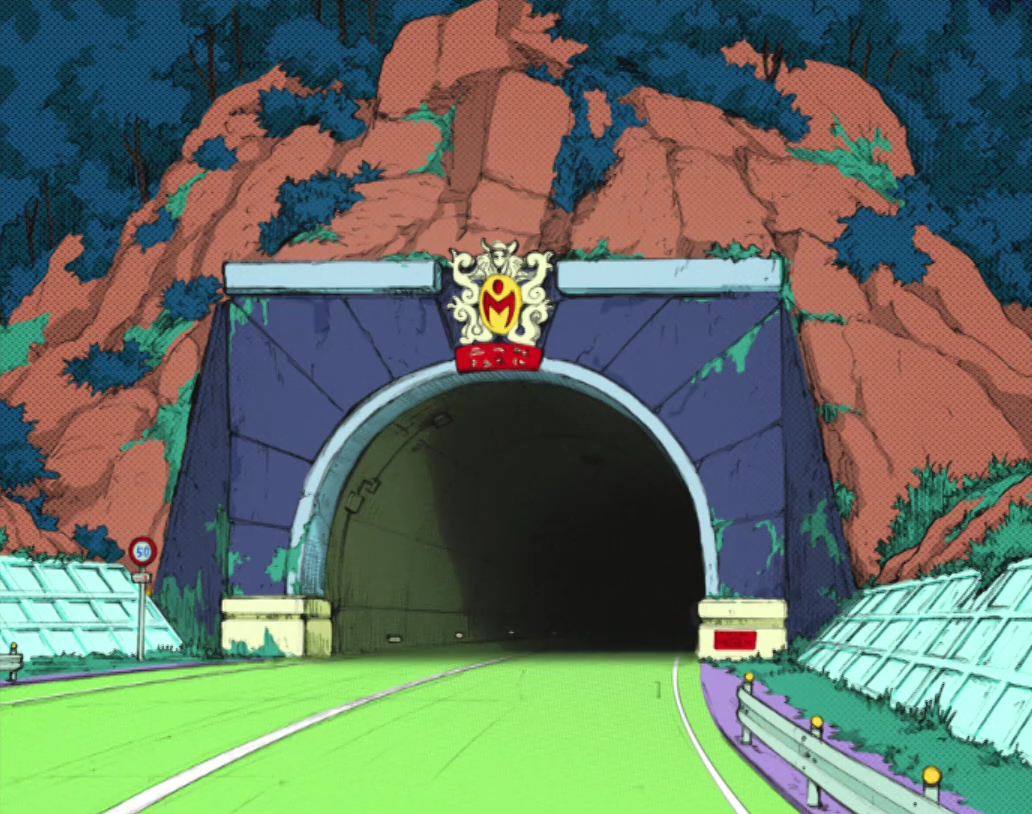 Completed in Kaei 5 (1852), the tunnel is used for vehicular road traffic coming from the north into South Morioh. On the front of tunnel, the Morioh Logo is visible. It is located on the outskirts of Morioh, next to Trussardi's and the cemetery. One must pass the tunnel if they were traveling from Morioh High School to downtown Morioh. Morioh resident, Josuke Higashikata, passes through this tunnel when taking the bus going home from school.