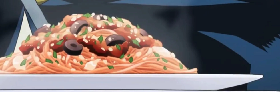 Ingredients: Spaghetti, Seedless Black Olives, Olive Oil, Garlic, Small tomatoes, Hot Pepper, Anchovy Fillet (1), Parsley, Salt, Pepper, Parmesan Cheese.