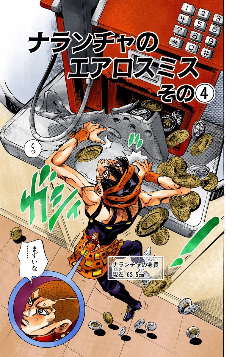 Now only sixty-two centimeters tall, Narancia climbs onto a pay phone so he can call Bucciarati and alert him to the enemy Stand users. Narancia inserts his coins and dials, but Formaggio, still hiding inside Narancia's pocket, cuts the phone lines.