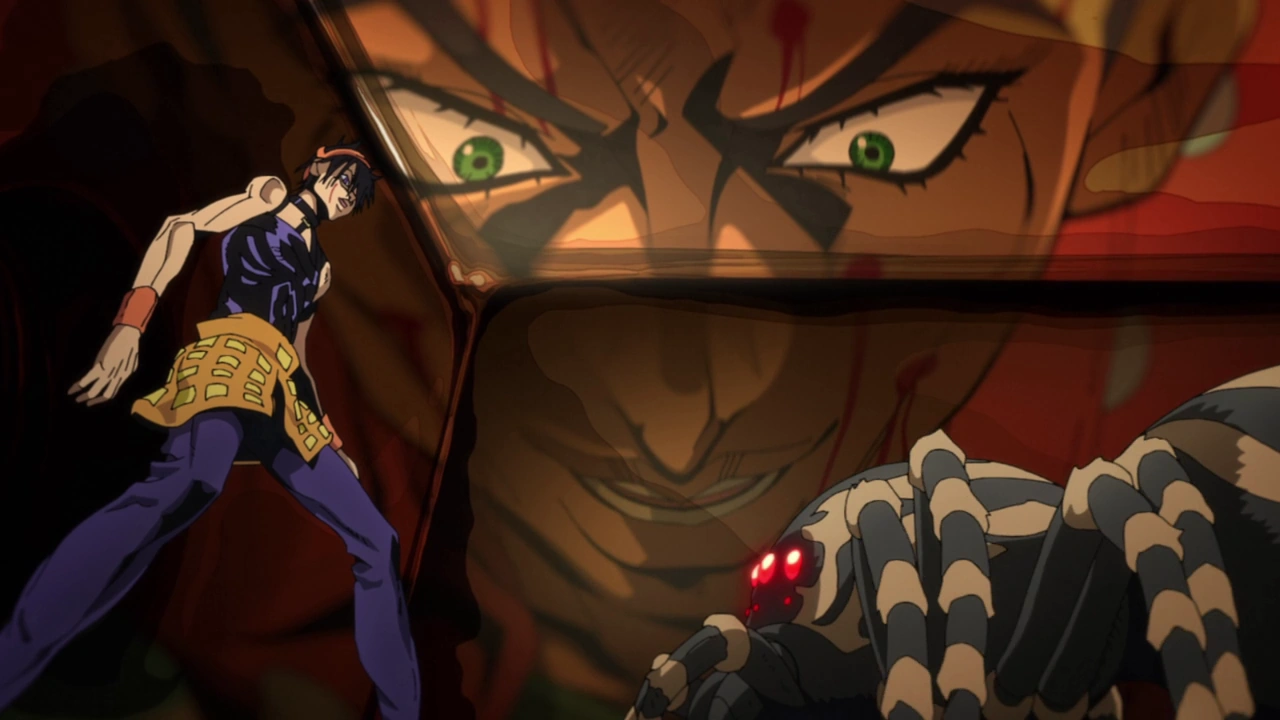 The spider appears huge compared to Narancia and Formaggio gleefully wonders about its venom dissolving Narancia's insides. The boy reveals that he's taken a glass shard with him as a makeshift knife and defends himself courageously, but the spider soon uses its web to trap and bind him. Finally defeated, Narancia persists in his silence, but Formaggio spots a map Narancia had previously used, which had fallen out of his pocket. Growing the map back to its normal size, Formaggio finally discovers where Team Bucciarati is hiding.