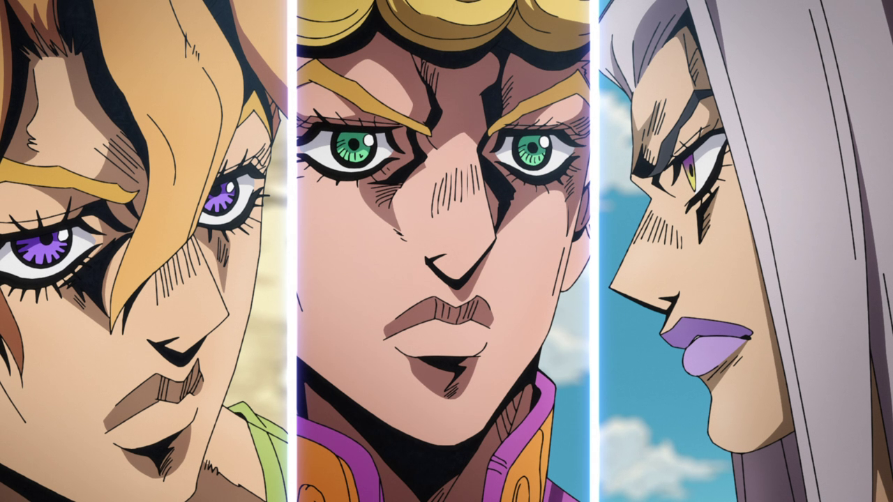 - In the manga, there is no dialogue while Giorno is looking at Trish, whereas in the anime, Fugo can be heard telling Narancia to repeat the story and to take the fact that the enemy found out their location more seriously.