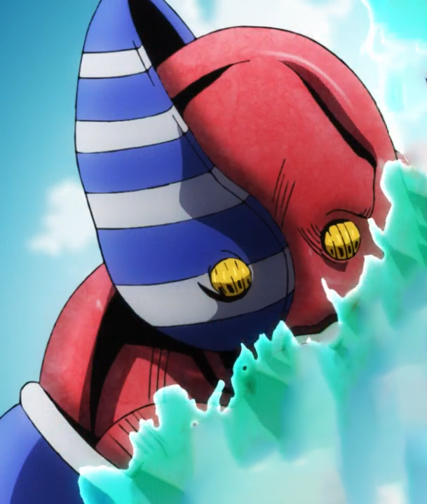 In both the colored manga and PS2 video game adaptation, Notorious B.I.G is portrayed as being primarily purple, with white and blue striped body parts and yellow eyes. In the anime adaptation, it becomes flesh red.