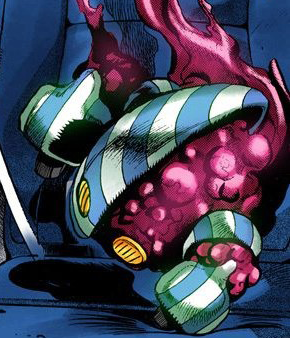 Although Giorno succeeds in throwing the Stand outside by cutting off his remaining hand, it quickly catches up to the plane and begins to attack Trish before shifting its focus to Giorno's brooch, which Gold Experience turned into a hand earlier. Trish's attempt to protect Giorno's hand leads to the awakening of her Stand Spice Girl, which allows Trish to impale and seemingly destroy Notorious B.I.G. In actuality, a piece of the immortal Stand entered the engine room and absorbed the energy of the engine, causing it to grow huge.